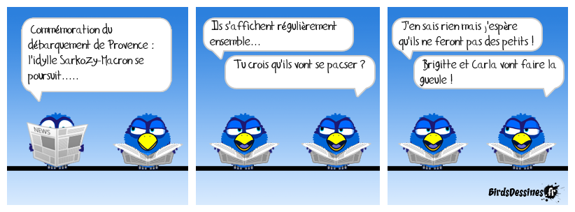 Case 1:Bird 1: Commémoration du débarquement de Provence : l'idylle Sarkozy-Macron se poursuit..... | Case 2: Bird 1: Ils s'affichent régulièrement ensemble... Bird 2: Tu crois qu'ils vont se pacser ? | Case 3: Bird 1: J'en sais rien mais j'espère qu'ils ne feront pas des petits ! Bird 2: Brigitte et Carla vont faire la gueule !