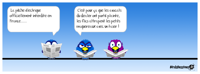 Case 1:Bird 1: La pêche électrique officiellement interdite en France..... | Case 2: Bird 1: C'est pour ça que les avocats du dealer ont porté plainte, les flics attrapent les petits maquereaux avec un taser ! | Case 3:
