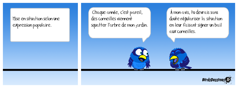 Case 1:Bird 1: Mise en situation selon une expression populaire. | Case 2: Bird 1: Chaque année, c'est pareil, des corneilles viennent squatter l'arbre de mon jardin. | Case 3: Bird 1: À mon avis, tu devrais sans doute régulariser la situation en leur faisant signer un bail aux corneilles.