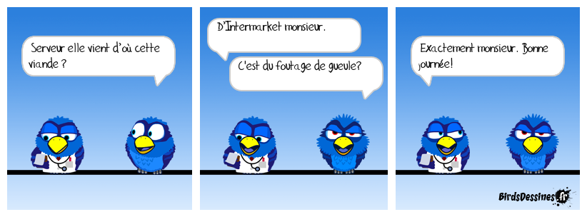 Case 1:Bird 1: Serveur elle vient d’où cette viande ? | Case 2: Bird 1: D’Intermarket monsieur. Bird 2: C'est du foutage de gueule? | Case 3: Bird 1: Exactement monsieur. Bonne journée!