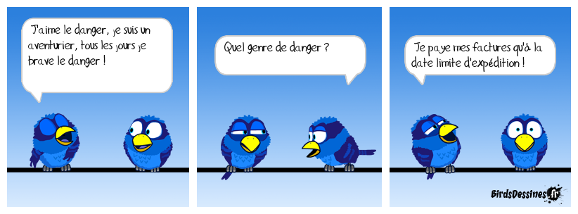 Case 1:Bird 1: J'aime le danger, je suis un aventurier, tous les jours je brave le danger ! | Case 2: Bird 1: Quel genre de danger ? | Case 3: Bird 1: Je paye mes factures qu'à la date limite d'expédition !