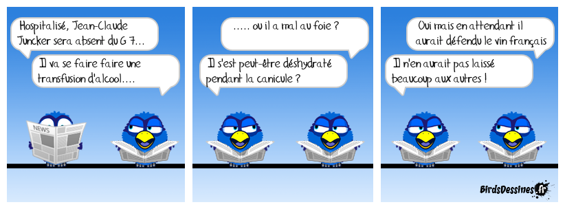Case 1:Bird 1: Hospitalisé, Jean-Claude Juncker sera absent du G 7...Bird 2: Il va se faire faire une transfusion d'alcool.... | Case 2: Bird 1: ..... ou il a mal au foie ? Bird 2: Il s'est peut-être déshydraté pendant la canicule ? | Case 3: Bird 1: Oui mais en attendant il aurait défendu le vin français lui ! Bird 2: Il n'en aurait pas laissé beaucoup aux autres !