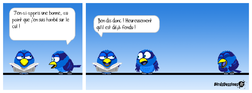 Case 1:Bird 1: J'en ai appris une bonne, au point que j'en suis tombé sur le cul ! | Case 2: Bird 1: Ben dis donc ! Heureusement qu'il est déjà fendu ! | Case 3: