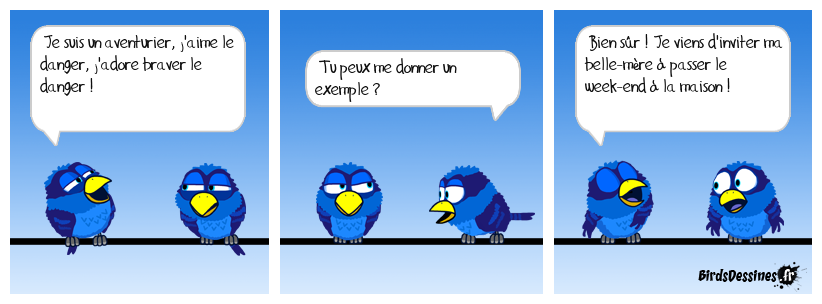 Case 1:Bird 1: Je suis un aventurier, j'aime le danger, j'adore braver le danger ! | Case 2: Bird 1: Tu peux me donner un exemple ? | Case 3: Bird 1: Bien sûr ! Je viens d'inviter ma belle-mère à passer le week-end à la maison !