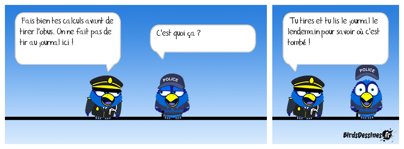 Case 1:Bird 1: Fais bien tes calculs avant de tirer l'obus. On ne fait pas de tir au journal ici ! | Case 2: Bird 1: C'est quoi ça ? | Case 3: Bird 1: Tu tires et tu lis le journal le lendemain pour savoir où c'est tombé !
