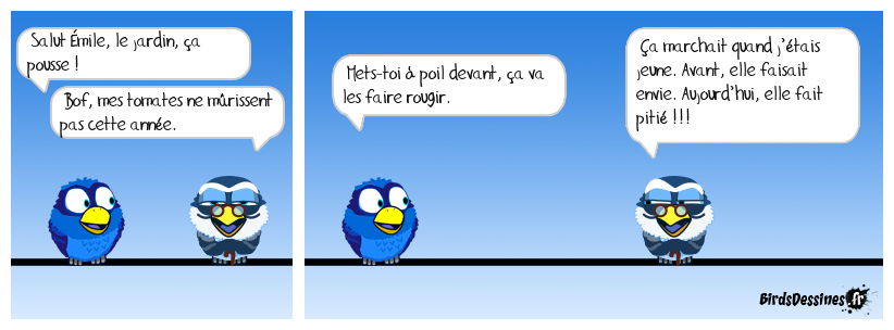 Case 1:Bird 1: Salut Èmile, le jardin, ça pousse ! Bird 2: Bof, mes tomates ne mûrissent pas cette année. | Case 2: Bird 1: Mets-toi à poil devant, ça va les faire rougir. | Case 3: Bird 1: Ça marchait quand j’étais jeune. Avant, elle faisait envie. Aujourd’hui, elle fait pitié !!!