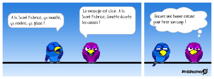 Case 1:Bird 1: A la Saint Fabrice, ça mouille, ça rentre, ça glisse ! | Case 2: Bird 1: Le message est clair. A la Saint Fabrice, Ginette écarte les cuisses ! | Case 3: Bird 1: Encore une bonne excuse pour tirer son coup !