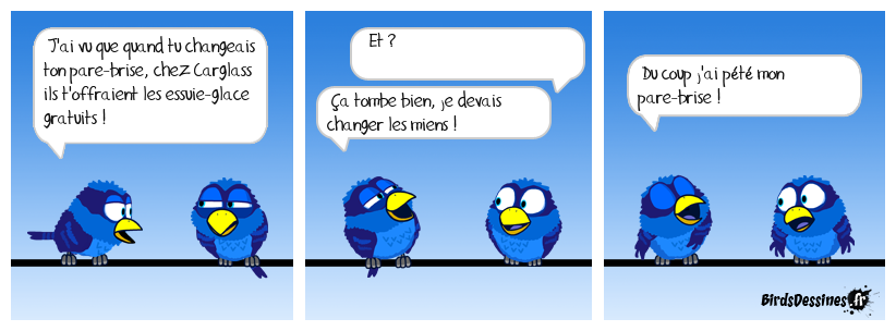 Case 1:Bird 1: J'ai vu que quand tu changeais ton pare-brise, chez Carglass ils t'offraient les essuie-glace gratuits ! | Case 2: Bird 1: Et ? Bird 2: Ça tombe bien, je devais changer les miens ! | Case 3: Bird 1: Du coup j'ai pété mon pare-brise !