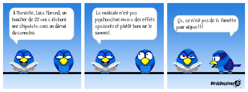 Case 1:Bird 1: À Marseille, Luca Morand, un boucher de 22 ans a élaboré une chipolata avec un dérivé du cannabis. | Case 2: Bird 1: La molécule n’est pas psychoactive mais a des effets apaisants et plutôt bons sur le sommeil. | Case 3: Bird 1: Ça, ce n’est pas de la fumette pour végan !!!