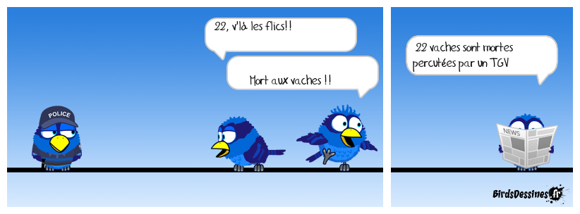Case 1: | Case 2: Bird 1: 22, v'là les flics!! Bird 2: Mort aux vaches !! | Case 3: Bird 1: 22 vaches sont mortes percutées par un TGV
