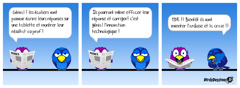 Case 1:Bird 1: Génial ! les écoliers vont pouvoir écrire leurs réponses sur une tablette et montrer leur résultat au prof ! | Case 2: Bird 1: Ils pourront même effacer leur réponse et corriger! c'est génial l'innovation technologique ! | Case 3: Bird 1: MDR !! Bientôt ils vont inventer l'ardoise et la craie !!