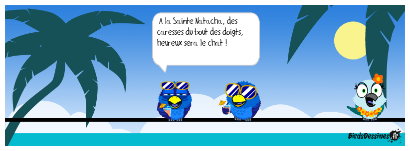 Case 1: | Case 2: Bird 1: A la Sainte Natacha, des caresses du bout des doigts, heureux sera le chat ! | Case 3: