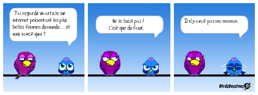 Case 1:Bird 1: J'ai regardé un article sur internet présentant les plus belles femmes du monde... et vous savez quoi ? | Case 2: Bird 1: ♥ Ne le lisez pas ! ♥ C'est que du faux. | Case 3: Bird 1: Il n'y avait pas ma maman.