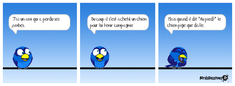 Case 1:Bird 1: J'ai un ami qui a perdu ses jambes. | Case 2: Bird 1: Du coup il s'est acheté un chien pour lui tenir compagnie | Case 3: Bird 1: Mais quand il dit "Au pied!" le chien pige que dalle.