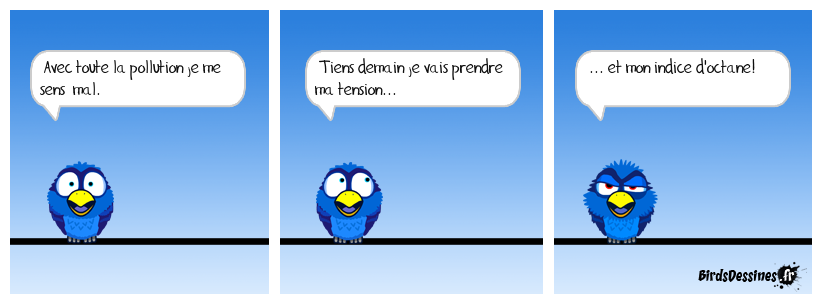 Case 1:Bird 1: Avec toute la pollution je me sens mal. | Case 2: Bird 1: Tiens demain je vais prendre ma tension... | Case 3: Bird 1: ... et mon indice d'octane!