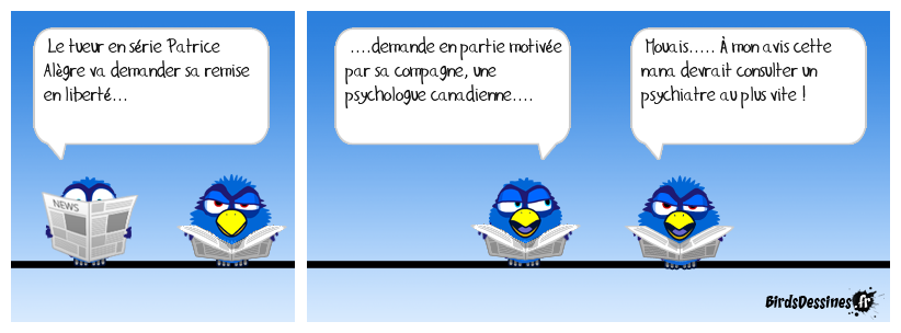 Case 1:Bird 1: Le tueur en série Patrice Alègre va demander sa remise en liberté... | Case 2: Bird 1: ....demande en partie motivée par sa compagne, une psychologue canadienne.... | Case 3: Bird 1: Mouais..... À mon avis cette nana devrait consulter un psychiatre au plus vite !