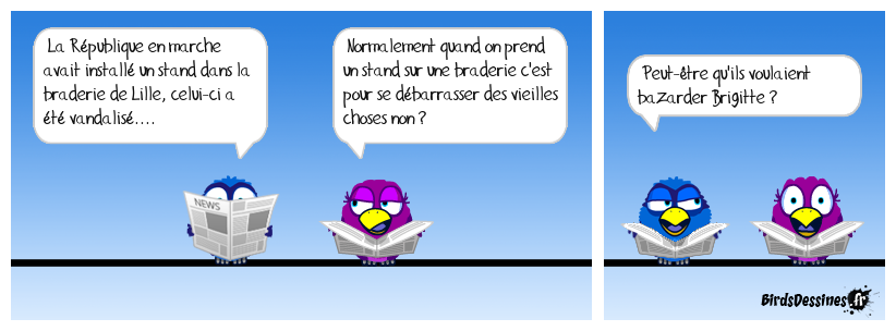 Case 1:Bird 1: La République en marche avait installé un stand dans la braderie de Lille, celui-ci a été vandalisé.... | Case 2: Bird 1: Normalement quand on prend un stand sur une braderie c'est pour se débarrasser des vieilles choses non ? | Case 3: Bird 1: Peut-être qu'ils voulaient bazarder Brigitte ?
