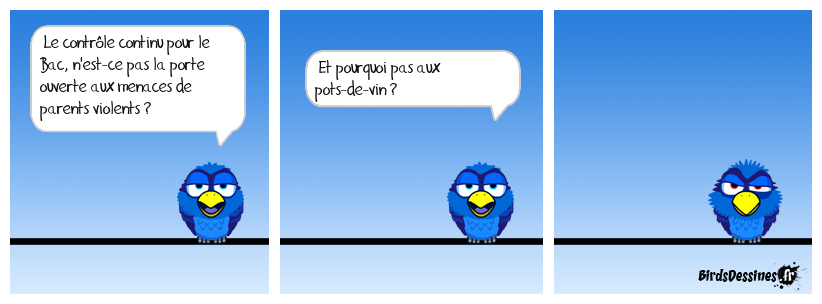Case 1:Bird 1: Le contrôle continu pour le Bac, n'est-ce pas la porte ouverte aux menaces de parents violents ? | Case 2: Bird 1: Et pourquoi pas aux pots-de-vin ? | Case 3: