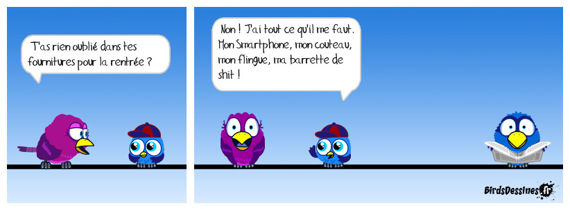 Case 1:Bird 1: T'as rien oublié dans tes fournitures pour la rentrée ? | Case 2: Bird 1: Non ! J'ai tout ce qu'il me faut. Mon Smartphone, mon couteau, mon flingue, ma barrette de shit ! | Case 3: