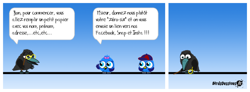 Case 1:Bird 1: Bon, pour commencer, vous allez remplir un petit papier avec vos nom, prénom, adresse,...etc,etc... | Case 2: Bird 1: M'sieur, donnez nous plutôt votre "zéro-six" et on vous envoie un lien vers nos Facebook, Snap et Insta !!! | Case 3: