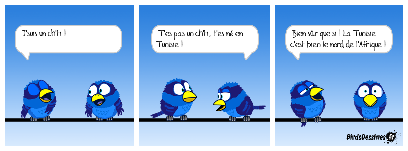 Case 1:Bird 1: J'suis un ch'ti ! | Case 2: Bird 1: T'es pas un ch'ti, t'es né en Tunisie ! | Case 3: Bird 1: Bien sûr que si ! La Tunisie c'est bien le nord de l'Afrique !