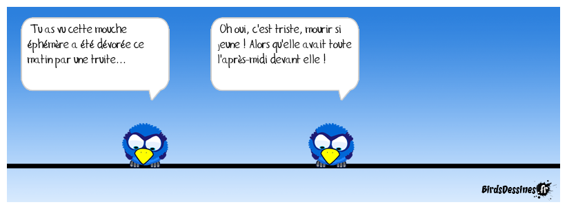 Case 1:Bird 1: Tu as vu cette mouche éphémère a été dévorée ce matin par une truite... | Case 2: Bird 1: Oh oui, c'est triste, mourir si jeune ! Alors qu'elle avait toute l'après-midi devant elle ! | Case 3: