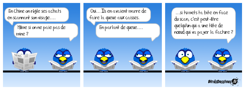 Case 1:Bird 1: En Chine on règle ses achats en scannant son visage....Bird 2: Même si on ne paie pas de mine ? | Case 2: Bird 1: Oui... Ils en avaient marre de faire la queue aux caisses. Bird 2: En parlant de queue.... | Case 3: Bird 1: ...si tu mets ta bite en face du scan, c'est peut-être quelqu'un qui a une tête de nœud qui va payer la facture ?
