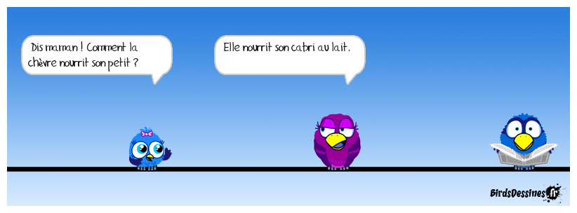 Case 1:Bird 1: Dis maman ! Comment la chèvre nourrit son petit ? | Case 2: Bird 1: Elle nourrit son cabri au lait. | Case 3: