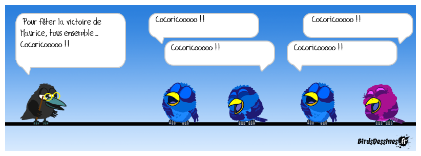 Case 1:Bird 1: Pour fêter la victoire de Maurice, tous ensemble… Cocoricooooo !! | Case 2: Bird 1: Cocoricooooo !! Bird 2: Cocoricooooo !! | Case 3: Bird 1: Cocoricooooo !! Bird 2: Cocoricooooo !!