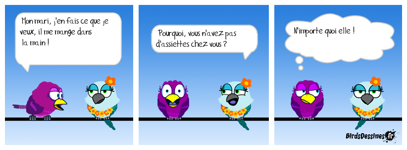 Case 1:Bird 1: Mon mari, j'en fais ce que je veux, il me mange dans la main ! | Case 2: Bird 1: Pourquoi, vous n'avez pas d'assiettes chez vous ? | Case 3: Bird 1: N'importe quoi elle !