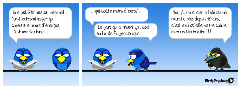 Case 1:Bird 1: Une pub EDF vue sur internet : "un électroménager qui consomme moins d’énergie, c’est une facture..... | Case 2: Bird 1: ....qui coûte moins d’euros". Bird 2: Le gars qui a trouvé ça, doit sortir de Polytechnique. | Case 3: Bird 1: Moi, j’ai une vieille télé qui ne marche plus depuis 10 ans, c’est vrai qu’elle ne me coûte rien en électricité !!!