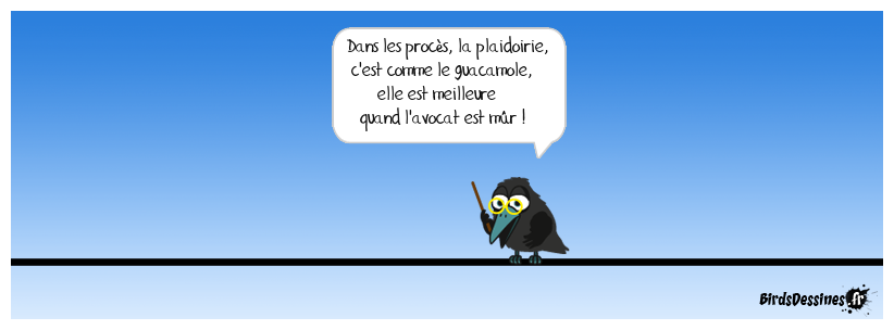 Case 1: | Case 2: Bird 1: Dans les procès, la plaidoirie, c'est comme le guacamole, elle est meilleure quand l'avocat est mûr ! | Case 3: