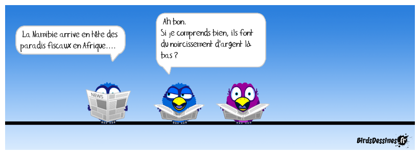 Case 1:Bird 1: La Namibie arrive en tête des paradis fiscaux en Afrique.... | Case 2: Bird 1: Ah bon. Si je comprends bien, ils font du noircissement d'argent là bas ? | Case 3: