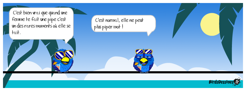 Case 1:Bird 1: C'est bien vrai que quand une femme te fait une pipe c'est un des rares moments où elle se tait. | Case 2: Bird 1: C'est normal, elle ne peut plus piper mot ! | Case 3: