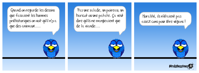 Case 1:Bird 1: Quand on regarde les dessins que faisaient les hommes préhistoriques on voit qu'il n'y a que des animaux..... | Case 2: Bird 1: Pas une salade, un poireau, un haricot ou une patate. Ça veut dire qu'ils ne mangeaient que de la viande.... | Case 3: Bird 1: Moralité, ils n'étaient pas assez cons pour être végans !