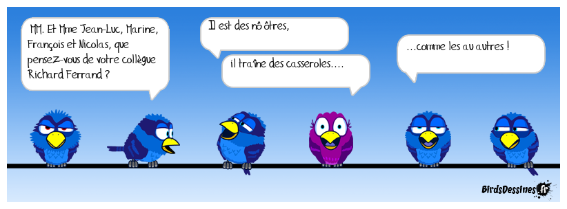 Case 1:Bird 1: MM. Et Mme Jean-Luc, Marine, François et Nicolas, que pensez-vous de votre collègue Richard Ferrand ? | Case 2: Bird 1: Il est des nô ôtres, Bird 2: il traïne des casseroles.... | Case 3: Bird 1: ...comme les au autres !