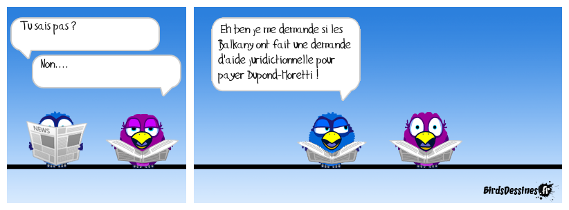 Case 1:Bird 1: Tu sais pas ? Bird 2: Non.... | Case 2: Bird 1: Eh ben je me demande si les Balkany ont fait une demande d'aide juridictionnelle pour payer Dupond-Moretti ! | Case 3: