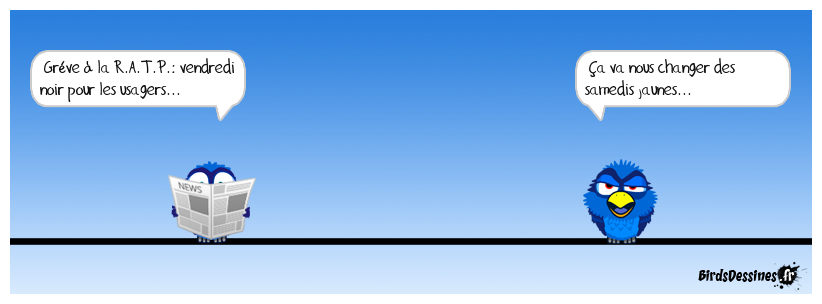 Case 1:Bird 1: Gréve à la R.A.T.P.: vendredi noir pour les usagers... | Case 2: | Case 3: Bird 1: Ça va nous changer des samedis jaunes...