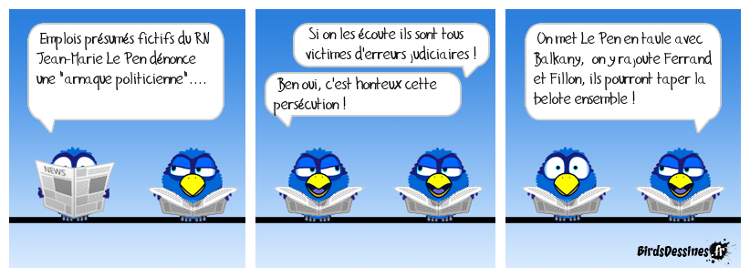 Case 1:Bird 1: Emplois présumés fictifs du RN Jean-Marie Le Pen dénonce une "arnaque politicienne".... | Case 2: Bird 1: Si on les écoute ils sont tous victimes d'erreurs judiciaires ! Bird 2: Ben oui, c'est honteux cette persécution ! | Case 3: Bird 1: On met Le Pen en taule avec Balkany, on y rajoute Ferrand et Fillon, ils pourront taper la belote ensemble !