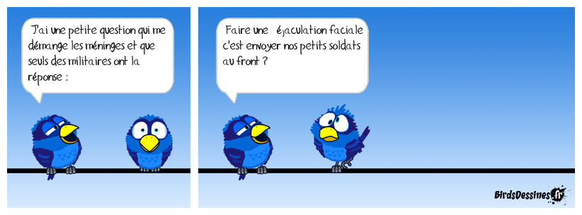 Case 1:Bird 1: J'ai une petite question qui me démange les méninges et que seuls des militaires ont la réponse : | Case 2: Bird 1: Faire une éjaculation faciale c'est envoyer nos petits soldats au front ? | Case 3: