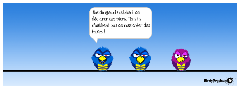 Case 1: | Case 2: Bird 1: Nos dirigeants oublient de déclarer des biens. Mais ils n'oublient pas de nous créer des taxes ! | Case 3: