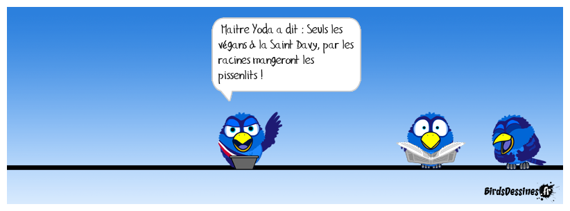 Case 1: | Case 2: Bird 1: Maitre Yoda a dit : Seuls les végans à la Saint Davy, par les racines mangeront les pissenlits ! | Case 3: