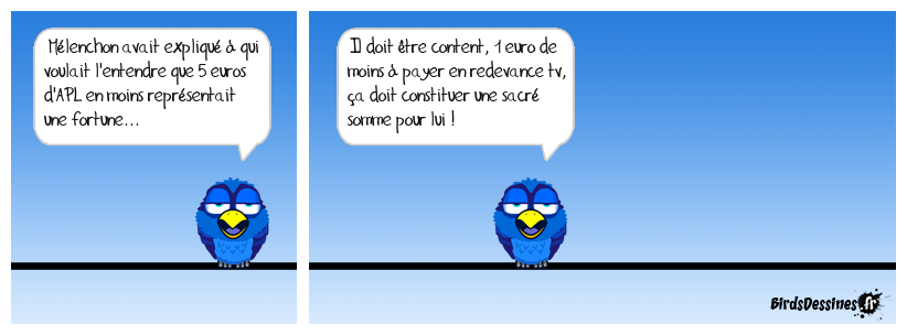 Case 1:Bird 1: Mélenchon avait expliqué à qui voulait l'entendre que 5 euros d'APL en moins représentait une fortune... | Case 2: Bird 1: Il doit être content, 1 euro de moins à payer en redevance tv, ça doit constituer une sacré somme pour lui ! | Case 3: