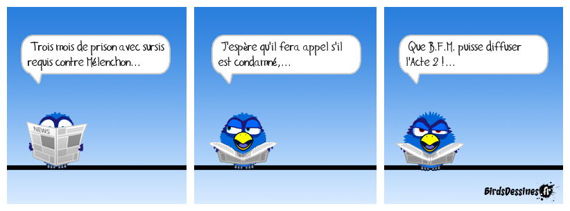 Case 1:Bird 1: Trois mois de prison avec sursis requis contre Mélenchon... | Case 2: Bird 1: J'espère qu'il fera appel s'il est condamné,... | Case 3: Bird 1: Que B.F.M. puisse diffuser l'Acte 2 !...