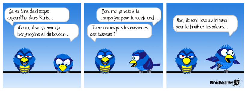 Case 1:Bird 1: Ça va être dantesque aujourd'hui dans Paris...Bird 2: Wouai, il va y avoir du lacrymogène et du boucan... | Case 2: Bird 1: Bon, moi je vais à la campagne pour le week-end ... Bird 2: Tu ne crains pas les nuisances des bouseux ? | Case 3: Bird 1: Non, ils sont tous au tribunal pour le bruit et les odeurs...