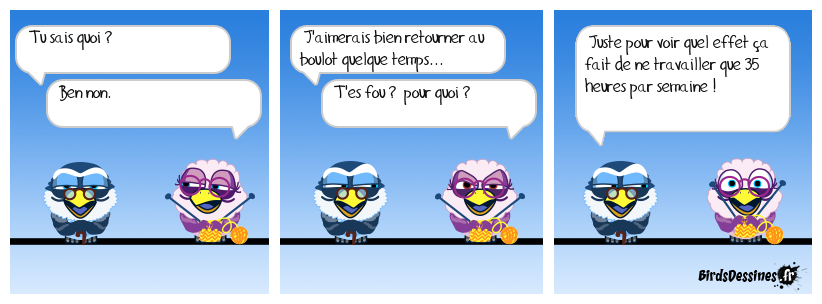 Case 1:Bird 1: Tu sais quoi ? Bird 2: Ben non. | Case 2: Bird 1: J'aimerais bien retourner au boulot quelque temps... Bird 2: T'es fou ? pour quoi ? | Case 3: Bird 1: Juste pour voir quel effet ça fait de ne travailler que 35 heures par semaine !