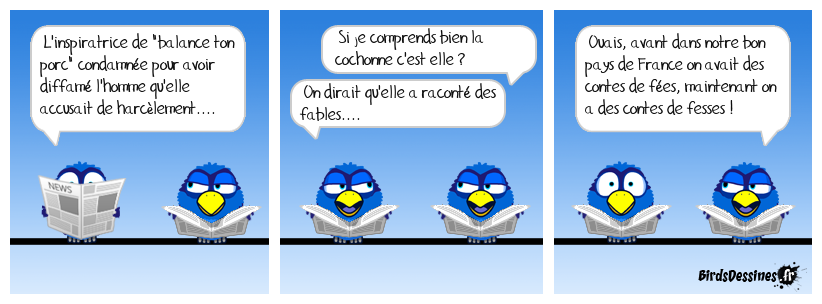 Case 1:Bird 1: L'inspiratrice de "balance ton porc" condamnée pour avoir diffamé l'homme qu'elle accusait de harcèlement.... | Case 2: Bird 1: Si je comprends bien la cochonne c'est elle ? Bird 2: On dirait qu'elle a raconté des fables.... | Case 3: Bird 1: Ouais, avant dans notre bon pays de France on avait des contes de fées, maintenant on a des contes de fesses !