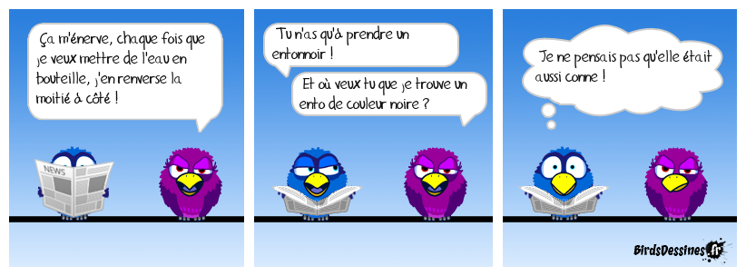 Case 1:Bird 1: Ça m'énerve, chaque fois que je veux mettre de l'eau en bouteille, j'en renverse la moitié à côté ! | Case 2: Bird 1: Tu n'as qu'à prendre un entonnoir ! Bird 2: Et où veux tu que je trouve un ento de couleur noire ? | Case 3: Bird 1: Je ne pensais pas qu'elle était aussi conne !