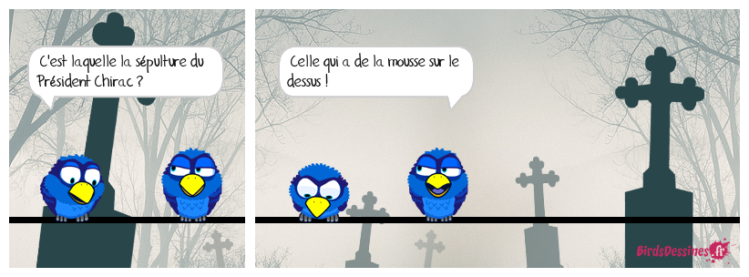 Case 1:Bird 1: C'est laquelle la sépulture du Président Chirac ? | Case 2: Bird 1: Celle qui a de la mousse sur le dessus ! | Case 3: