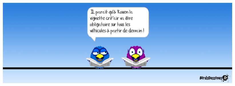 Case 1: | Case 2: Bird 1: IL paraît qu'à Rouen la vignette crit'air va être obligatoire sur tous les véhicules à partir de demain ! | Case 3: